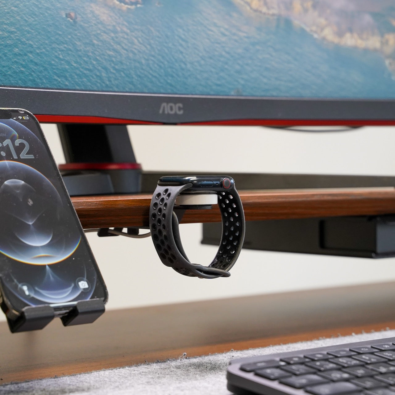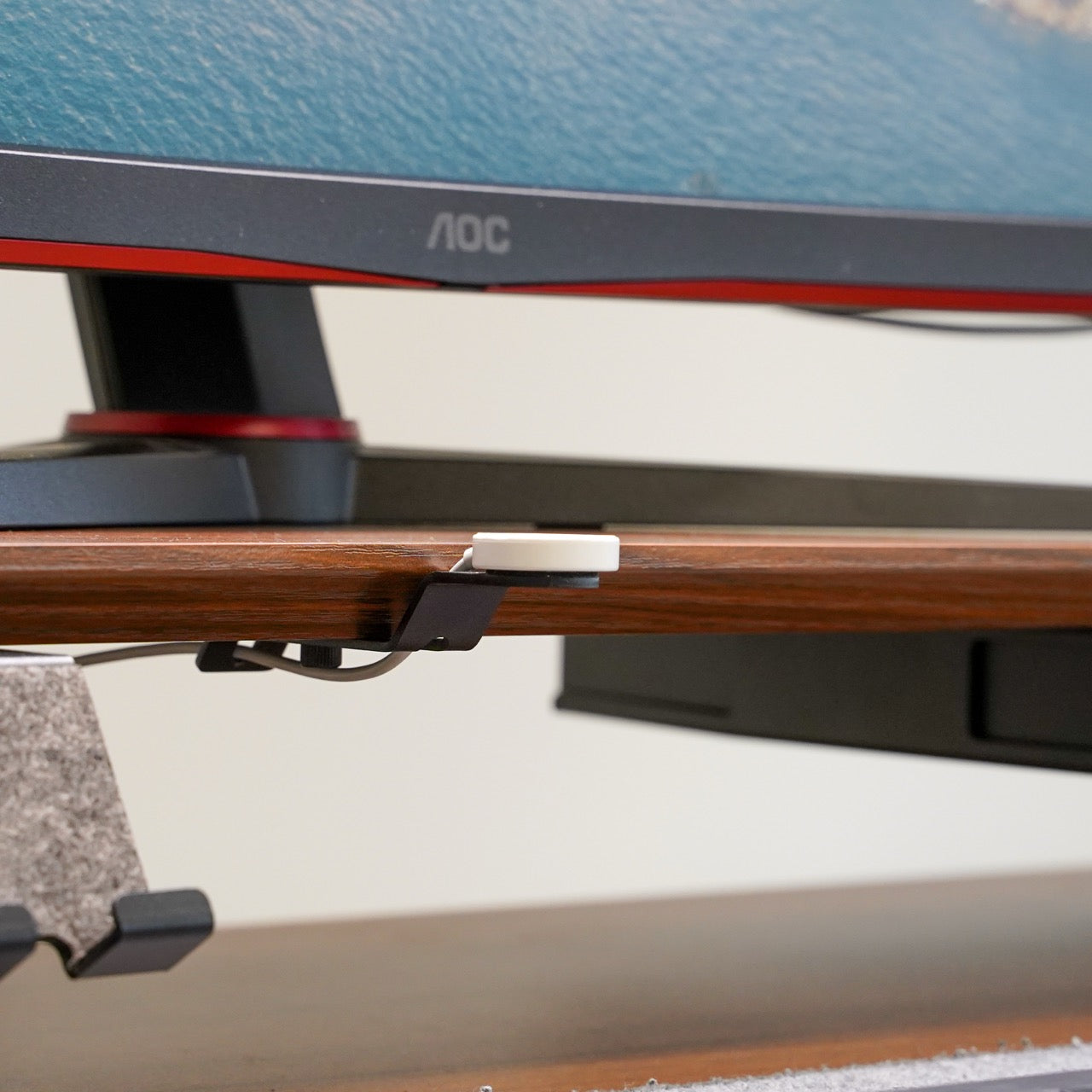 Der Watch Stand verwandelt ein loses Kabel in eine feste Ladestation am Monitorständer – immer griffbereit, nie im Weg. Über die stufenlose Schiene positionierst du die Halterung exakt neben dem Bildschirm, sodass du Ladefortschritt und Uhrzeit mit einem Blick erfasst. Das Kabel verschwindet im Layout deines Desks; nur der Apple-Watch-Puck bleibt sichtbar. Diese Ordnung zahlt täglich auf Produktivität ein: weniger Mikro-Entscheidungen, weniger Kabelsalat, mehr Fokus. Im Zusammenspiel mit Schublade, Laptop-Halter und Kopfhörerhalter entsteht ein Setup, das logisch „fließt“. Der Watch Stand ist ein kleines Bauteil mit spürbarem Effekt – funktional, unauffällig und konsequent auf Klarheit ausgelegt.