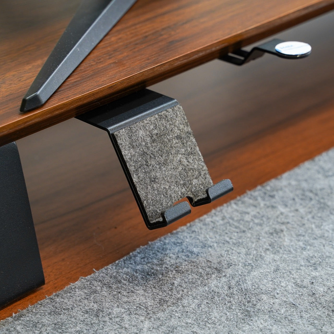 Gute Tools fühlen sich gut an. Der pulverbeschichtete Stahl ist formstark, kratzresistent und optisch zurückhaltend. Die Filzfläche schont Rückseiten, verhindert Vibrationen und dämpft Tippen oder Anstoßen leise weg. Die Frontlippen greifen das Gerät sicher, ohne Bedienelemente zu verdecken. Das matte Jet-Black-Finish fügt sich nahtlos in den Minimaldesk-Look ein – zusammen mit Holz, Aluminium oder dunklem Zubehör. Ergebnis: eine Halterung, die nicht wie Behelf wirkt, sondern wie ein integraler Teil des Systems – robust, leise und langlebig.