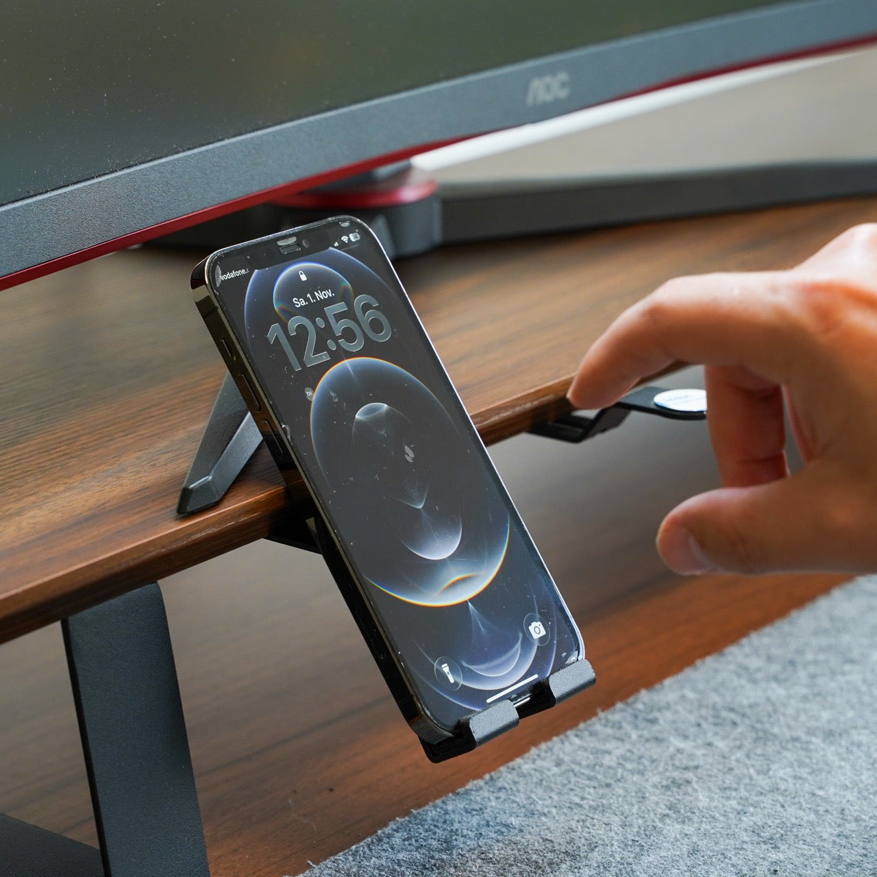 Die Handyhalterung parkt dein Smartphone (und kleine Tablets) sicher am Monitorständer. Du hast Benachrichtigungen, Timer und Musiksteuerung im Blick – die Hände bleiben frei für Fokus, Schreiben und Calls.