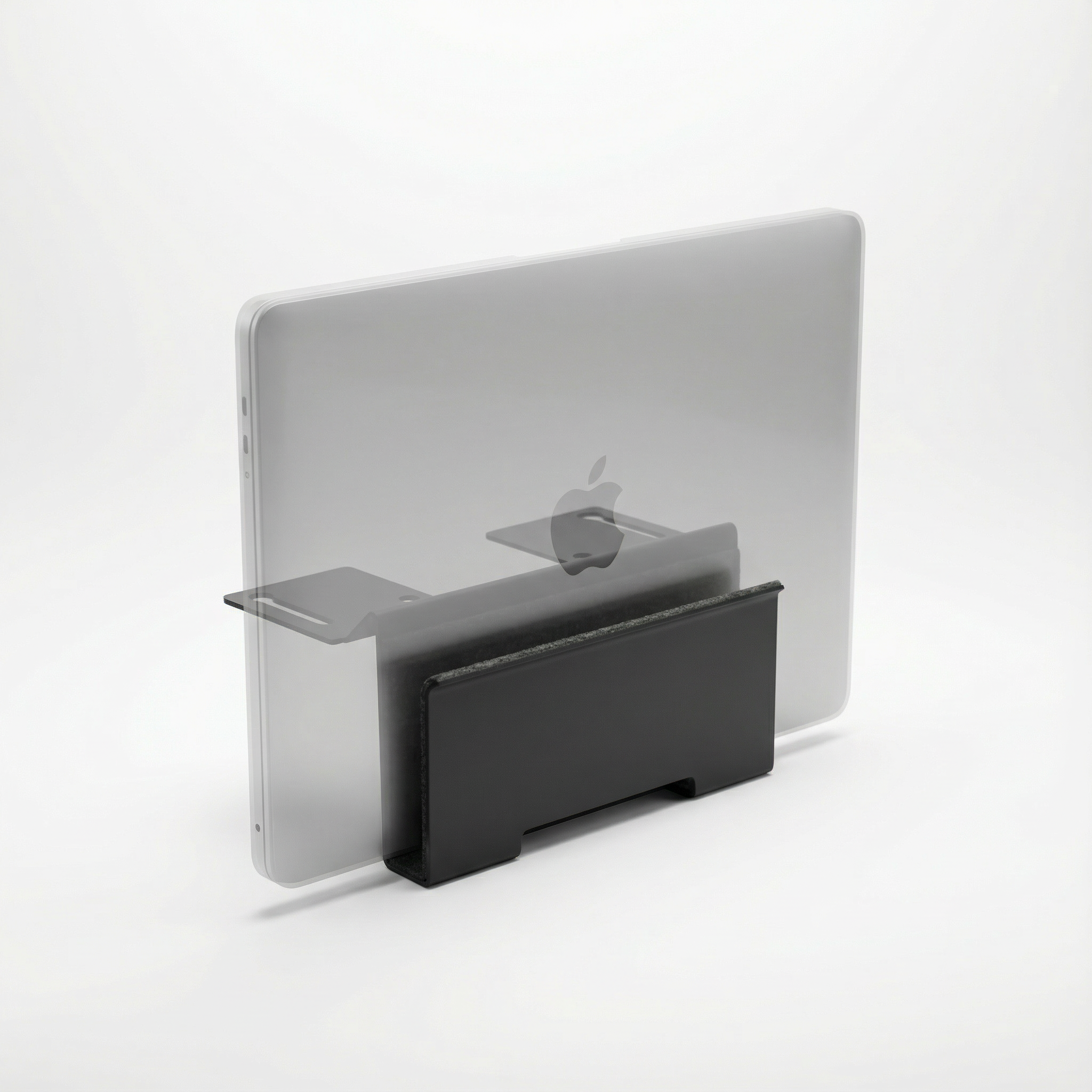 Pulverbeschichteter Stahl in Jet Black trifft auf Filz – das ergibt einen vertikalen Laptopständer, der satt in der Hand liegt, leise im Betrieb ist und tägliches Andocken mühelos wegsteckt. Die Kanten sind präzise, die Oberfläche unempfindlich, die Filzpolster der Laptop Halterung schützen Aluminium- und lackierte Chassis. Beim Einsetzen spürst du Führung statt Spiel; beim Abnehmen keine Kratzgefahr. Optisch fügt sich der Halter unaufdringlich ins Minimaldesk-Ökosystem: klare Linie, ruhige Flächen, kein technischer Wildwuchs. So wird das Laptop Dock nicht zum Fremdkörper, sondern zu einem integralen Bauteil deines Setups – mit der Solidität eines Tools, das für lange Sessions gebaut ist, und der Haptik, die man gern täglich nutzt.
