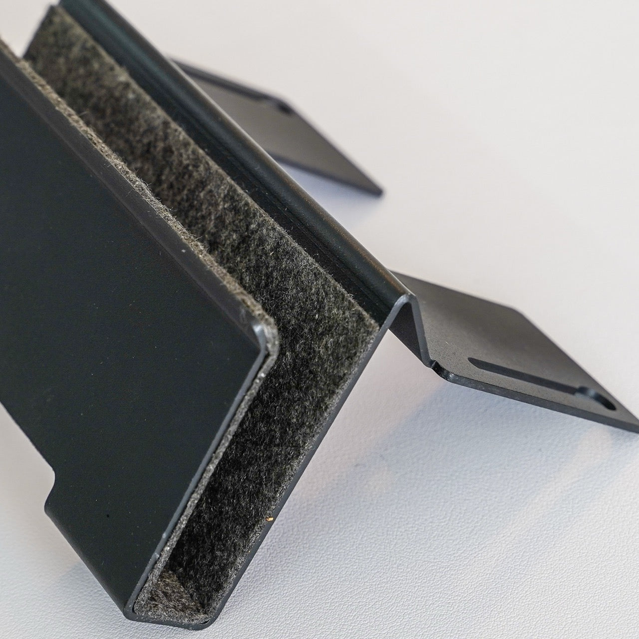 Der Jet-Black-Stahlkörper sorgt für Stabilität, die Filzpolsterung schützt vor Kratzern und dämpft Vibrationen. Geräte bis ca. 2,5 cm Dicke sitzen spielfrei – auch beim Greifen oder Einstecken von Kabeln.