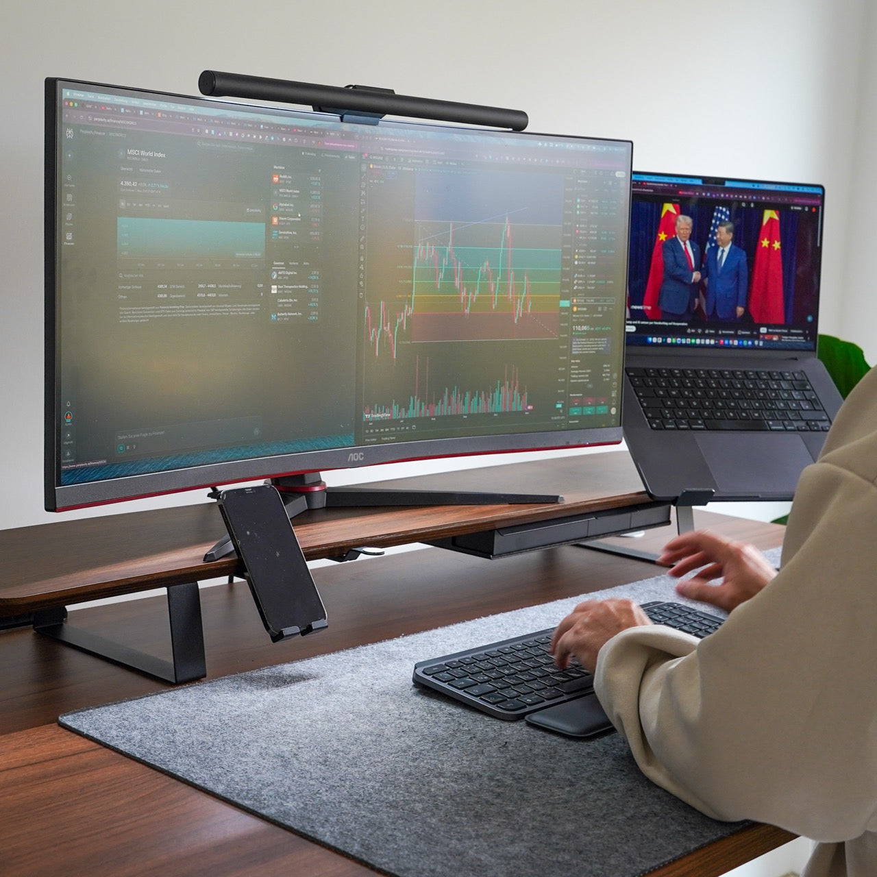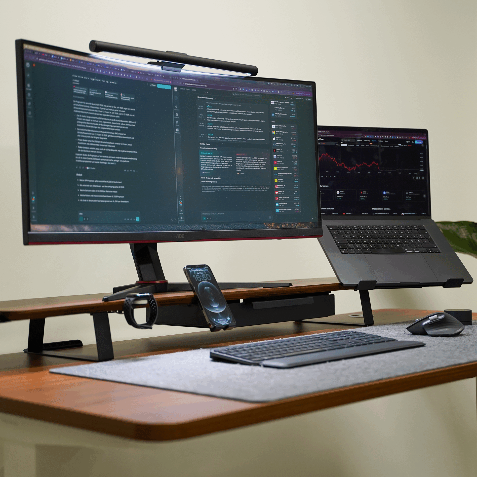 Der modulare Monitorständer von MinimalDesk bringt deinen Bildschirm auf Augenhöhe, schafft einezweite Ebene und hält den Schreibtisch clean. Das stufenlose Schienensystem gibt dir millimetergenaue Kontrolle über Add-ons – werkzeuglos angepasst, genau so, wie du arbeitest.