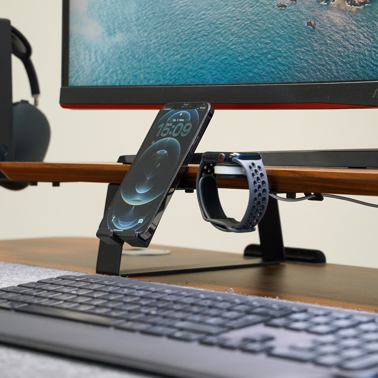 Vergiss starre Raster. Das stufenlose Schienensystem gibt dir millimetergenaue Kontrolle über jedes Add-on: ausziehbare Schublade, Laptopständer, Smart-Watch-Halter, Kopfhörerhalter, MagSafe-Halter. Schieben, positionieren, mit Rändelschrauben fixieren – werkzeuglos, jederzeit.