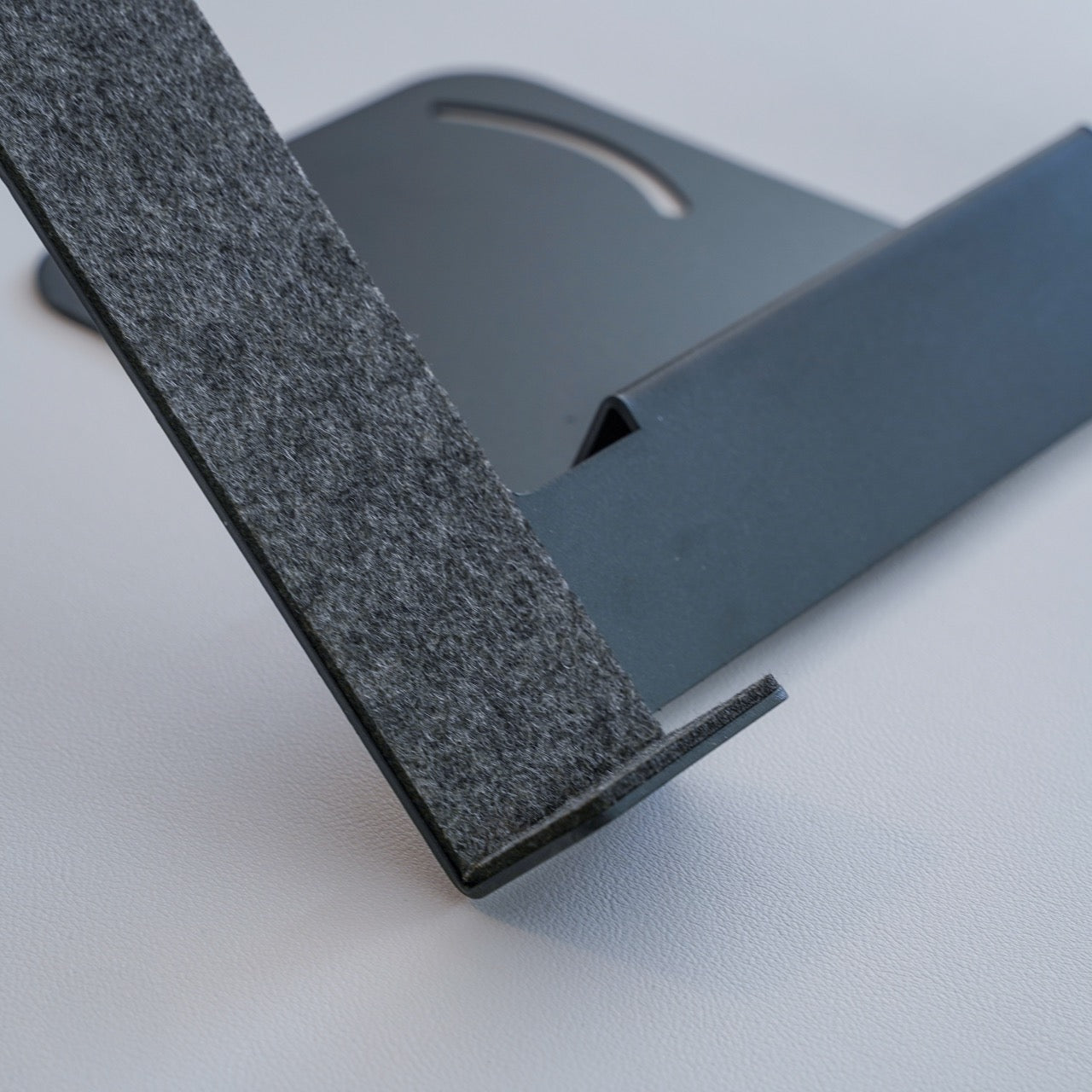 Der Stahlkörper verteilt Abwärme großflächig, die offene Konstruktion lässt Luft unter dem Gerät zirkulieren. Das schützt Performance in langen Sessions. Filzauflagen verhindern Kratzer und dämpfen Tippen oder Ablegen angenehm leise.